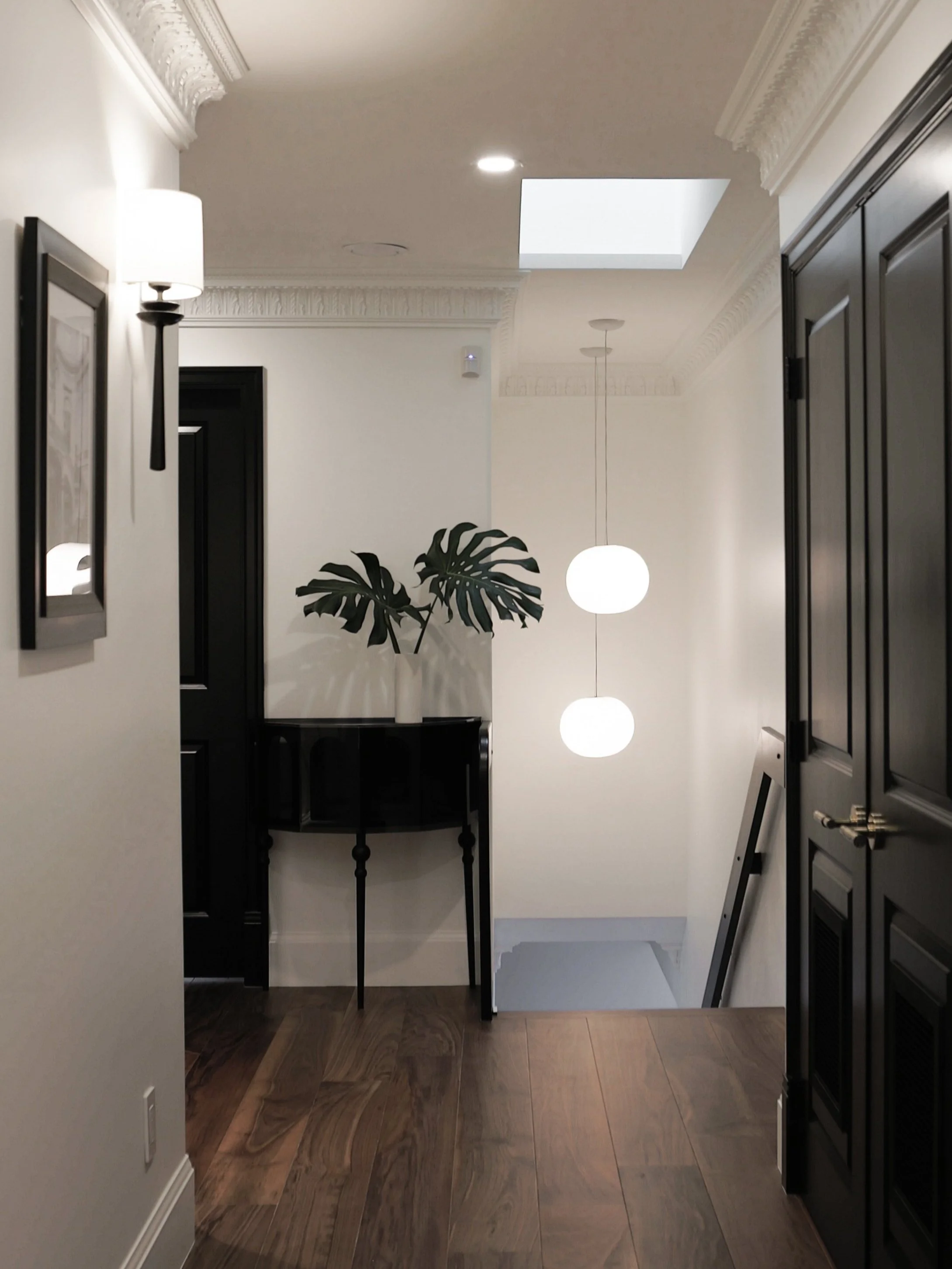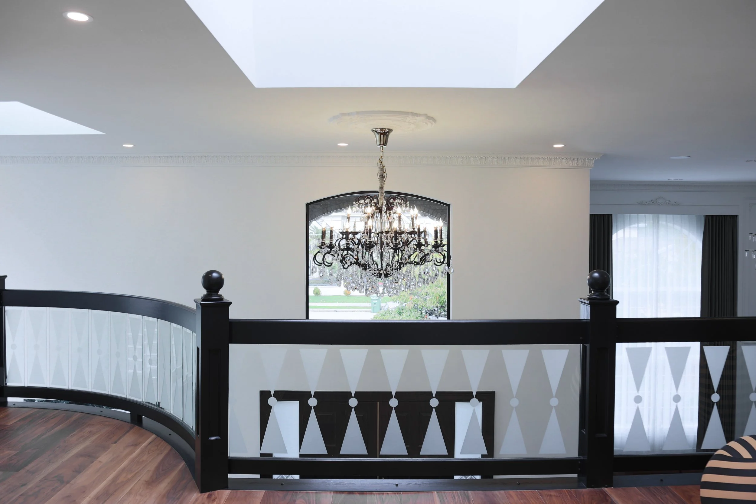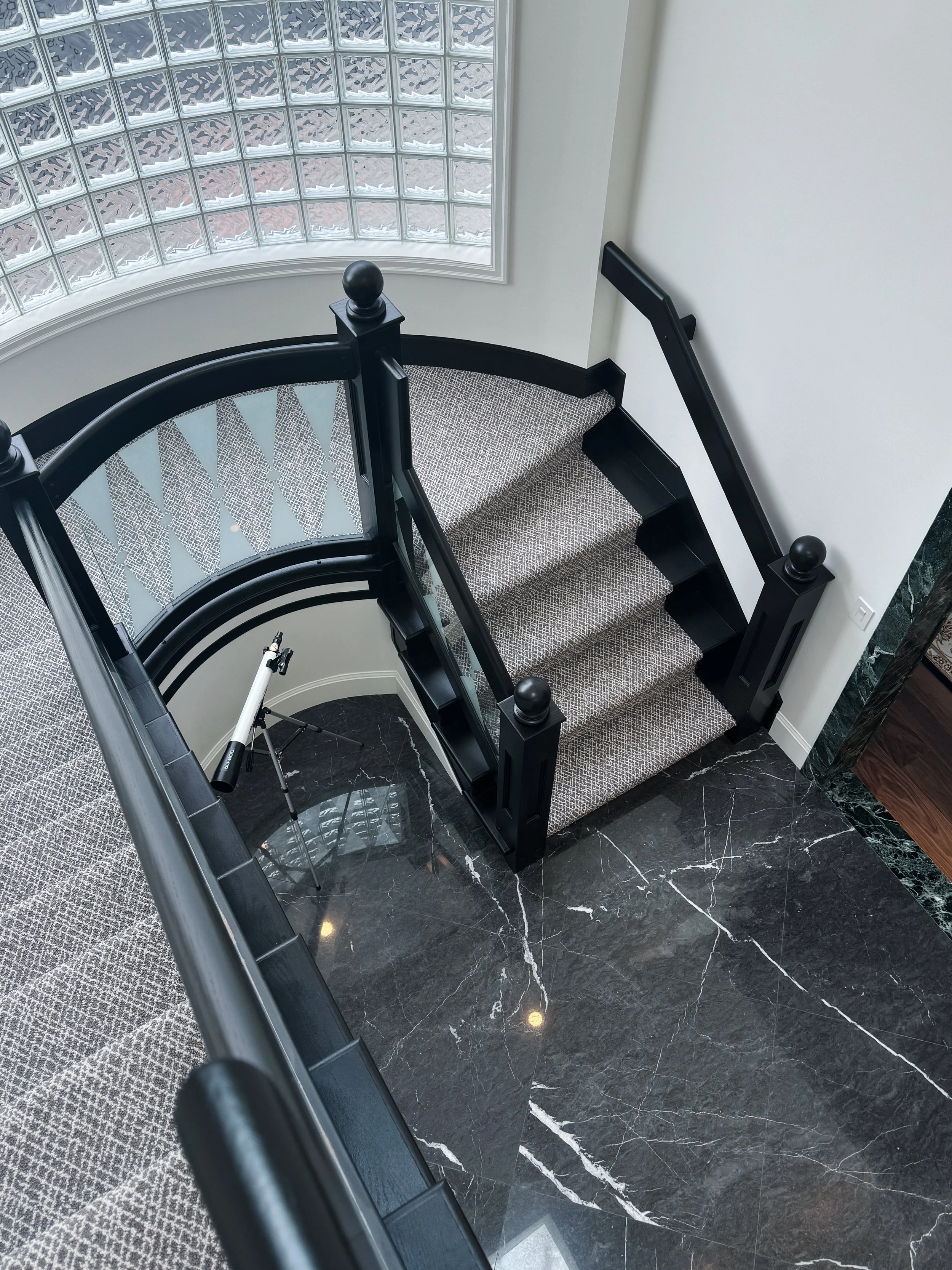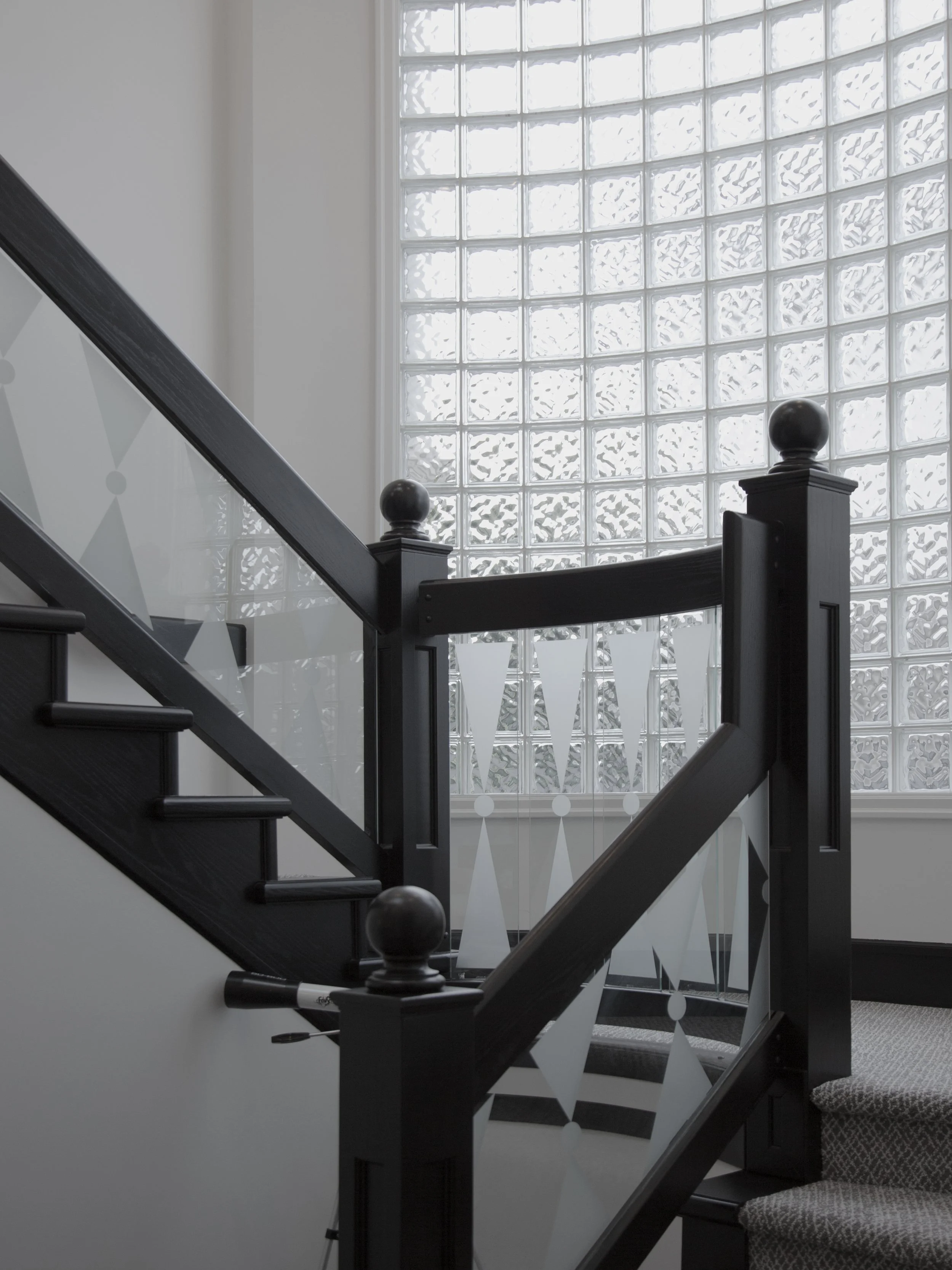 We retained the original staircase railing and applied a fresh coat of black paint. The existing geometric patterns on the glass perfectly resonate with the new space.