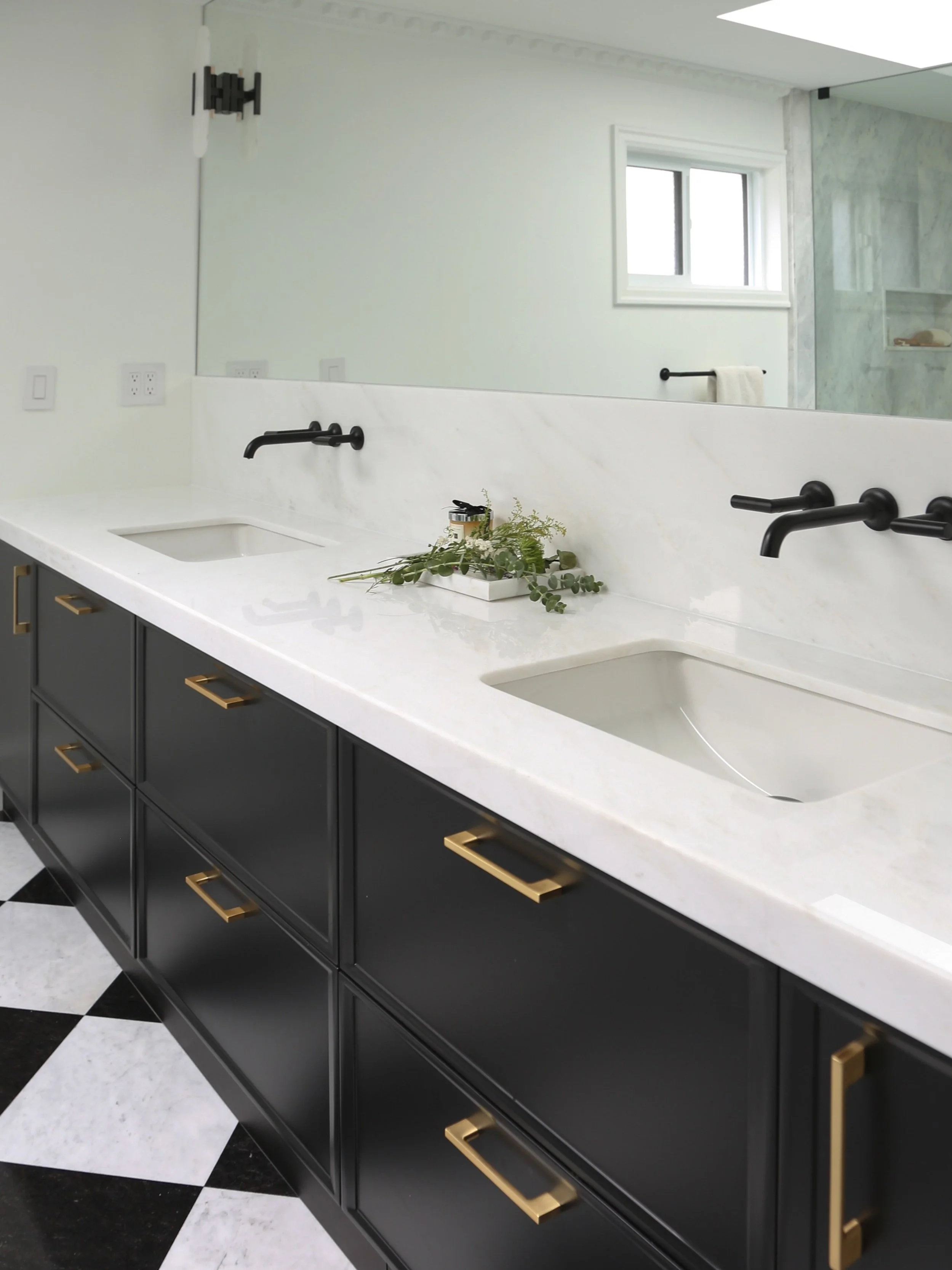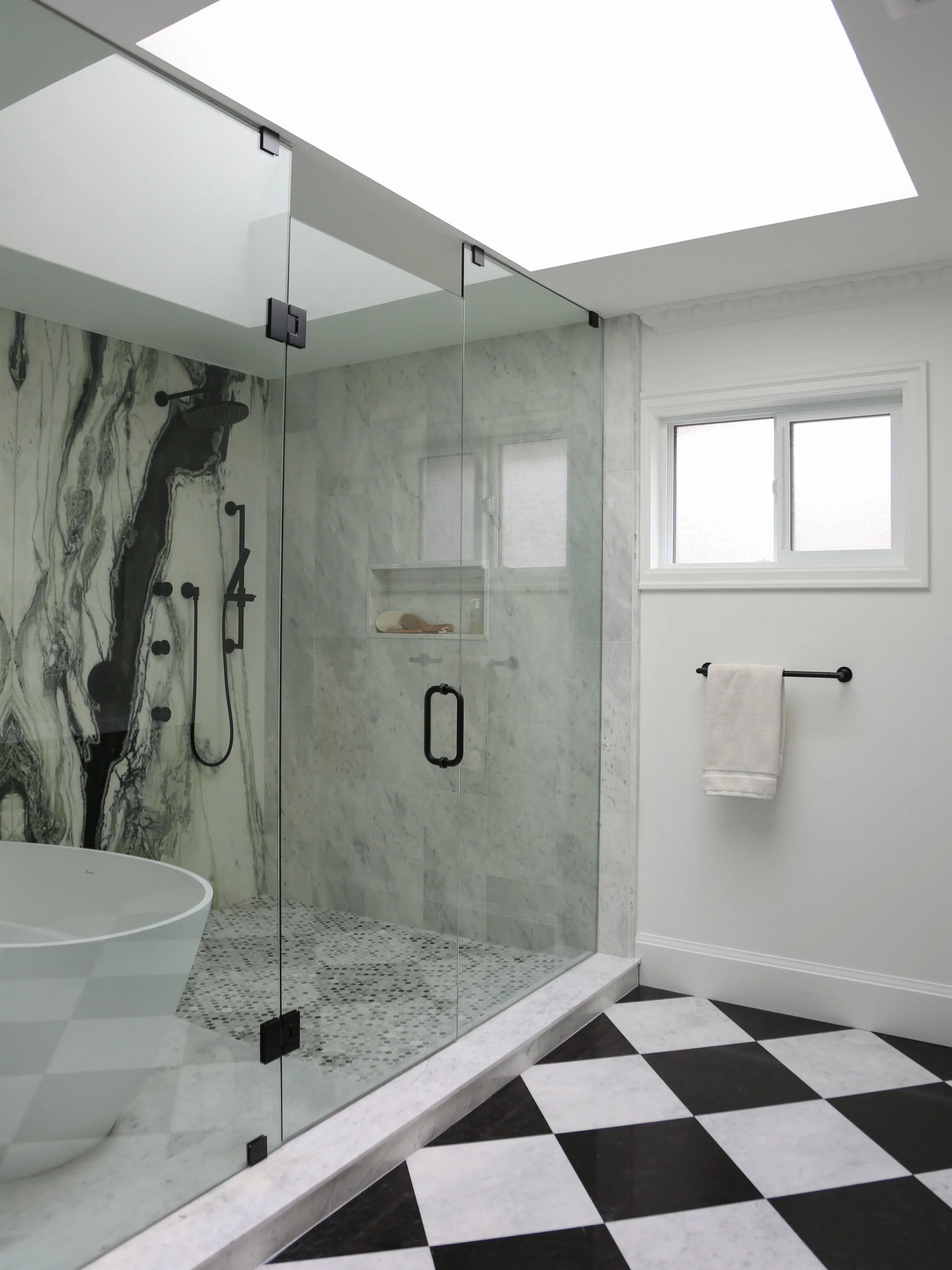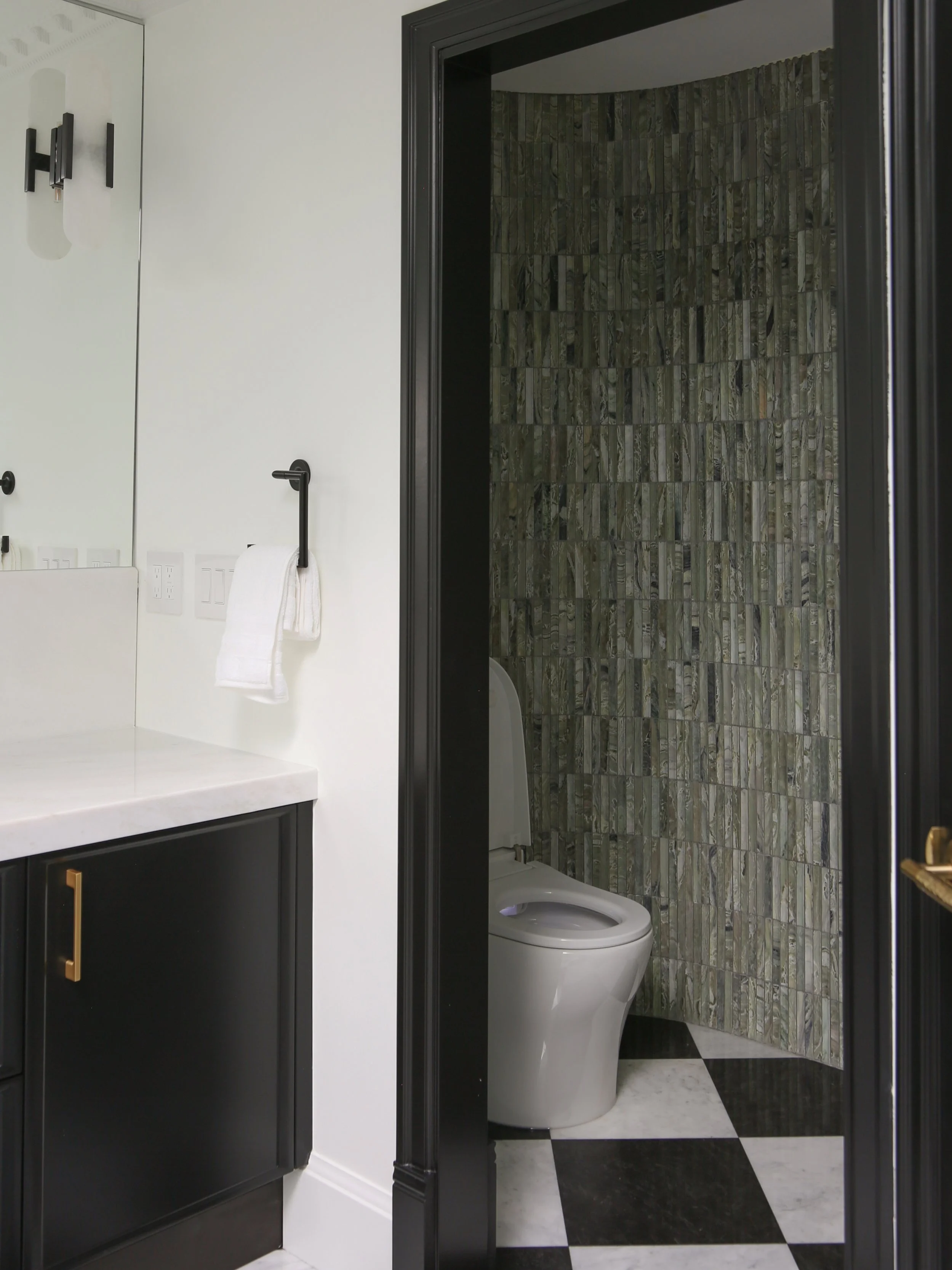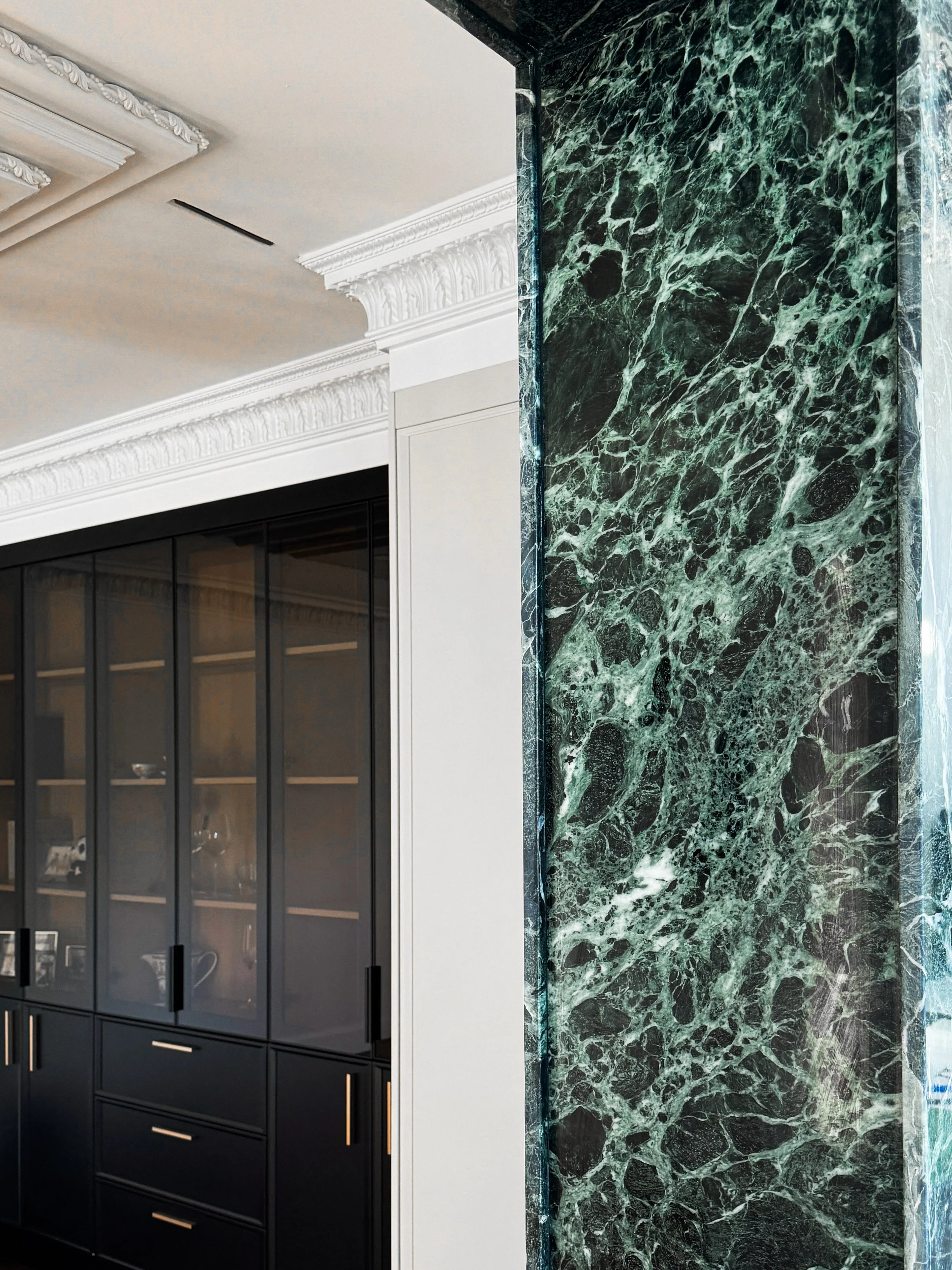 We retained the original staircase railing and applied a fresh coat of black paint. The existing geometric patterns on the glass perfectly resonate with the new space.