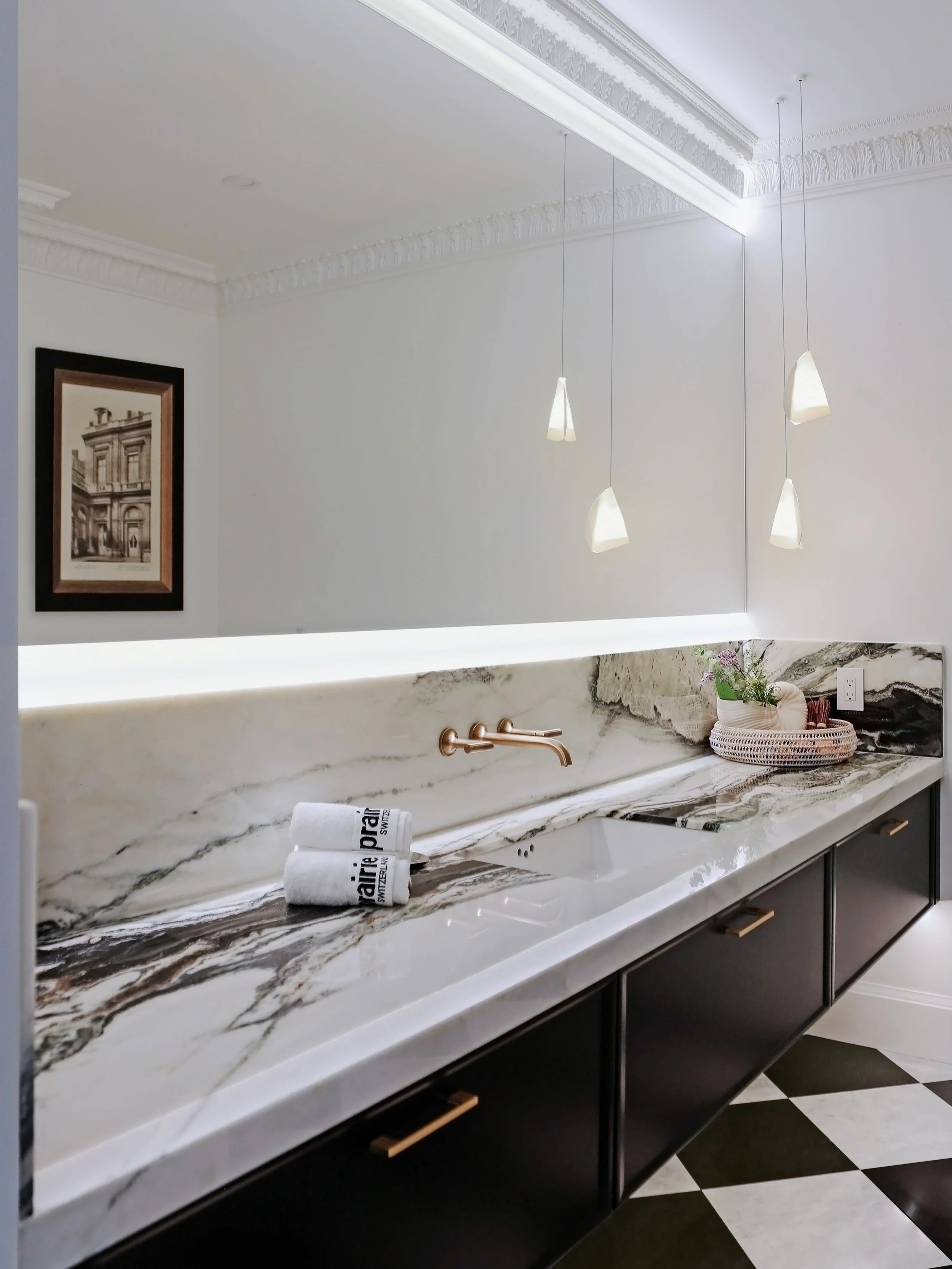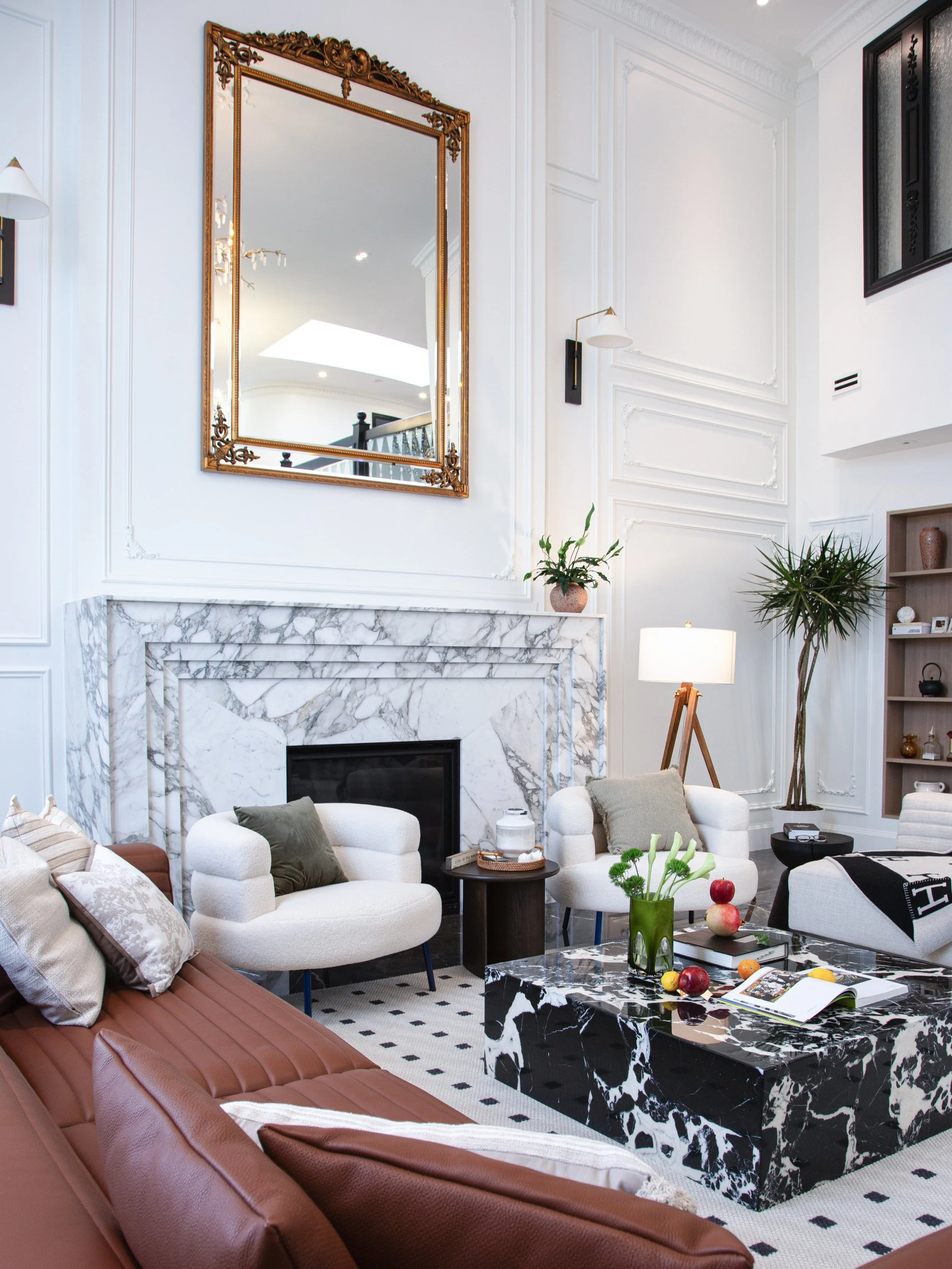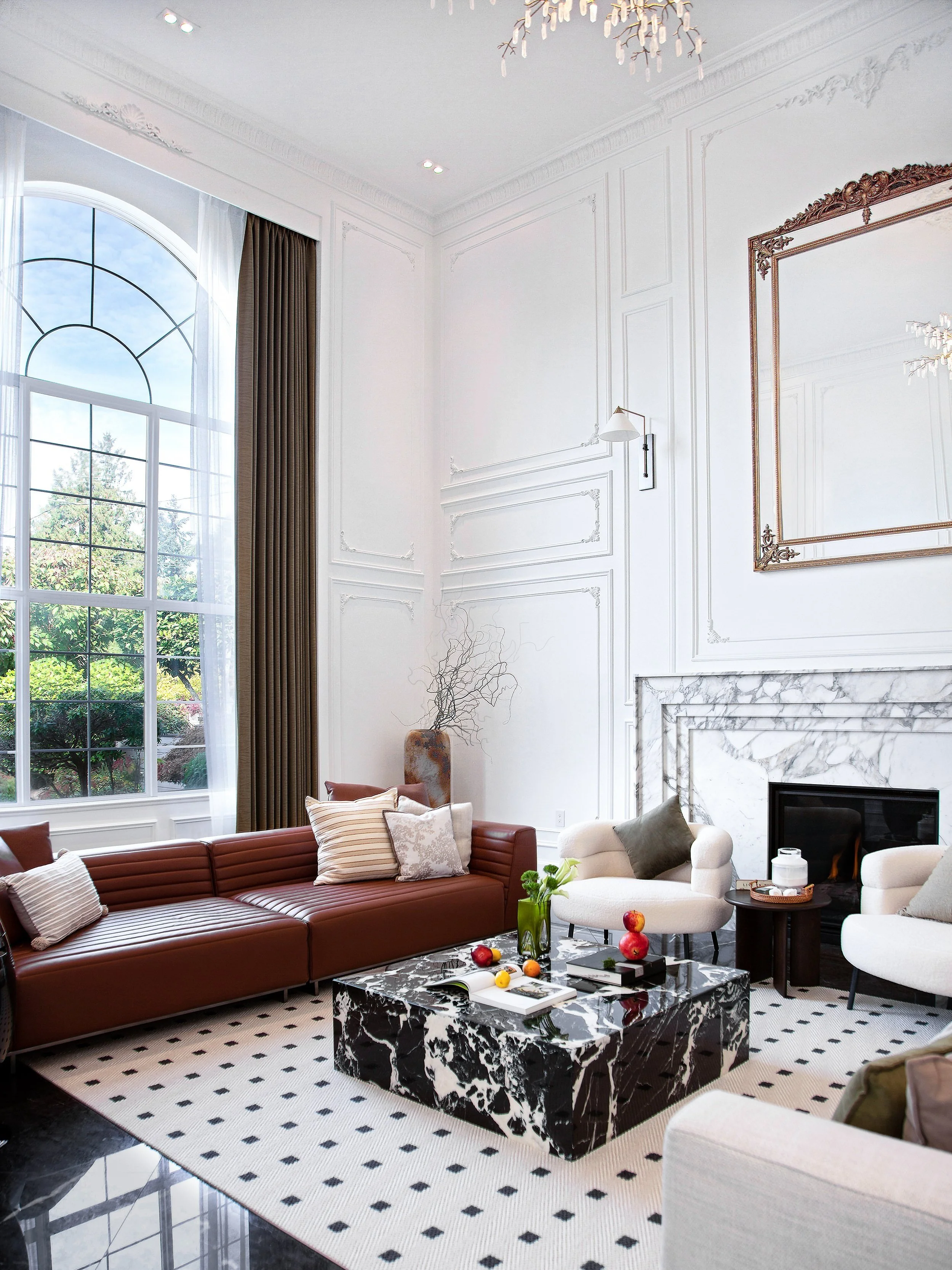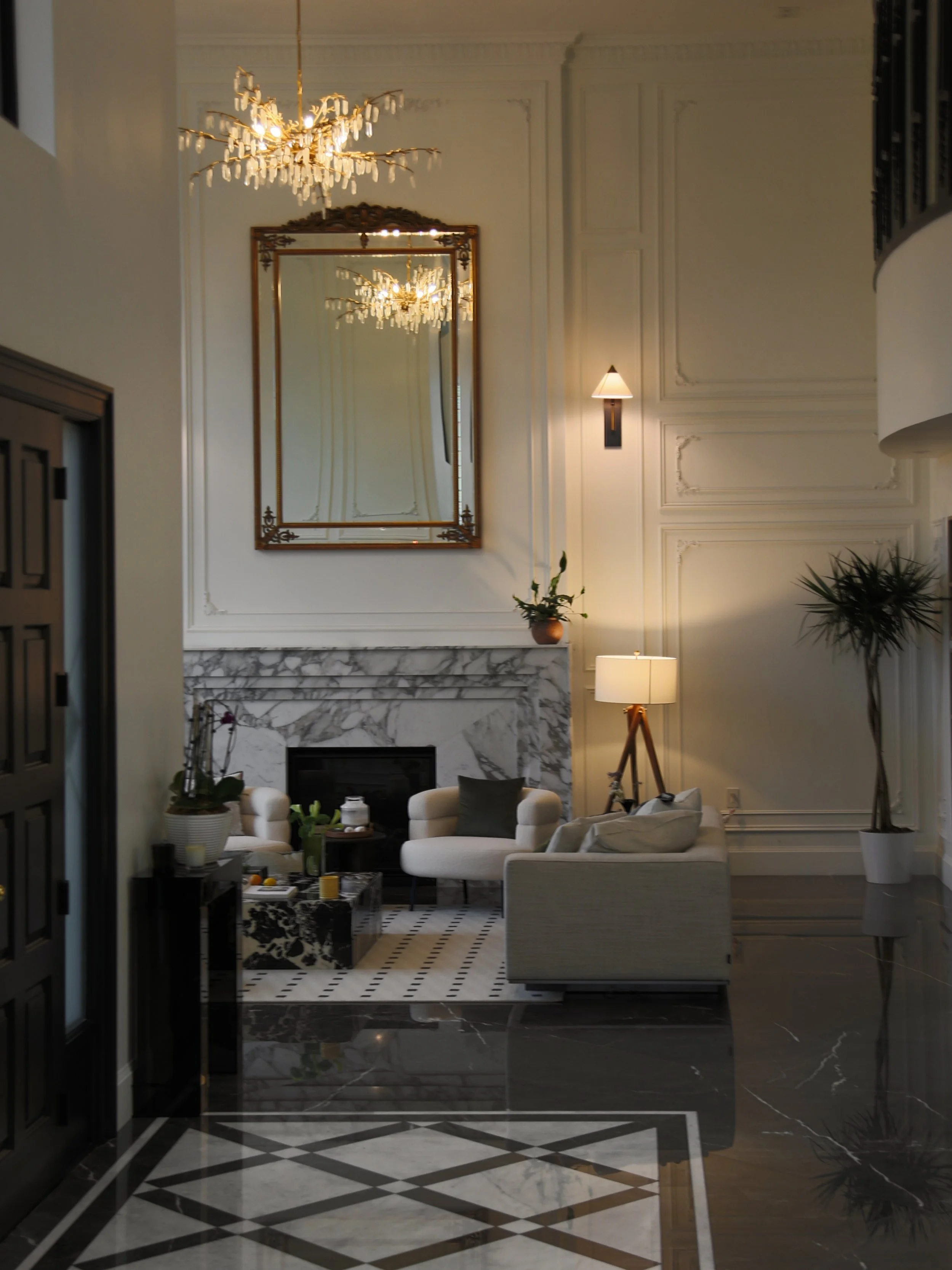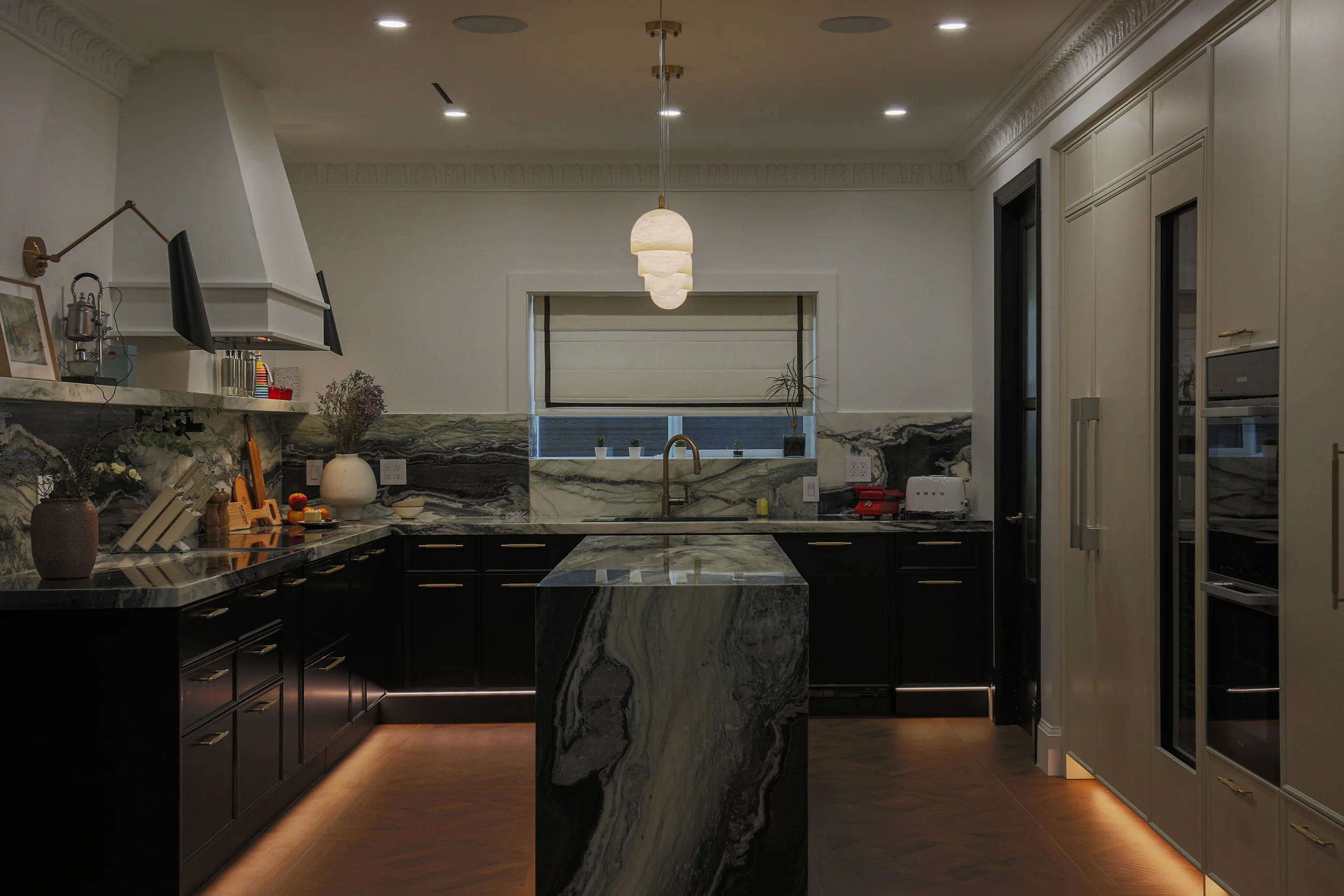 Elegant marble, rich wood, and handcrafted pieces with rustic textures are complemented by bespoke lighting and custom furniture designs, crafting a serene and tasteful environment.