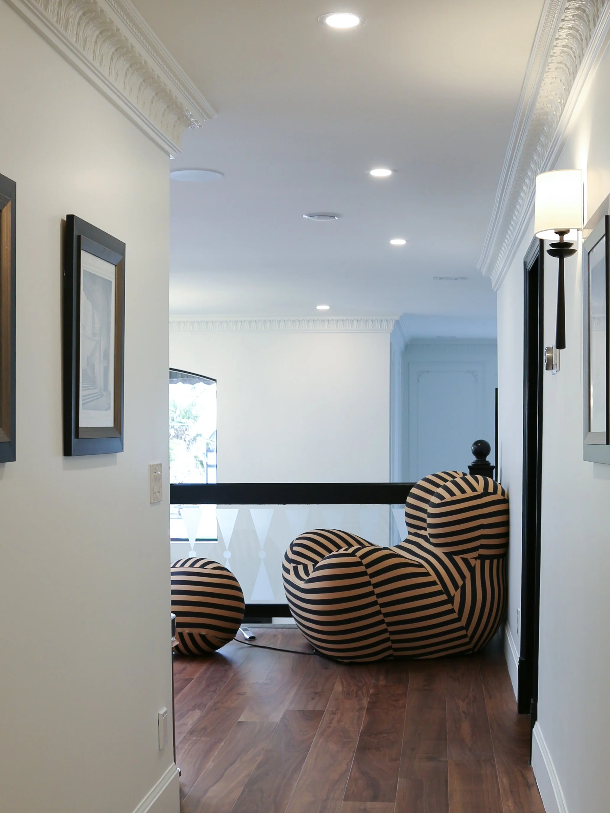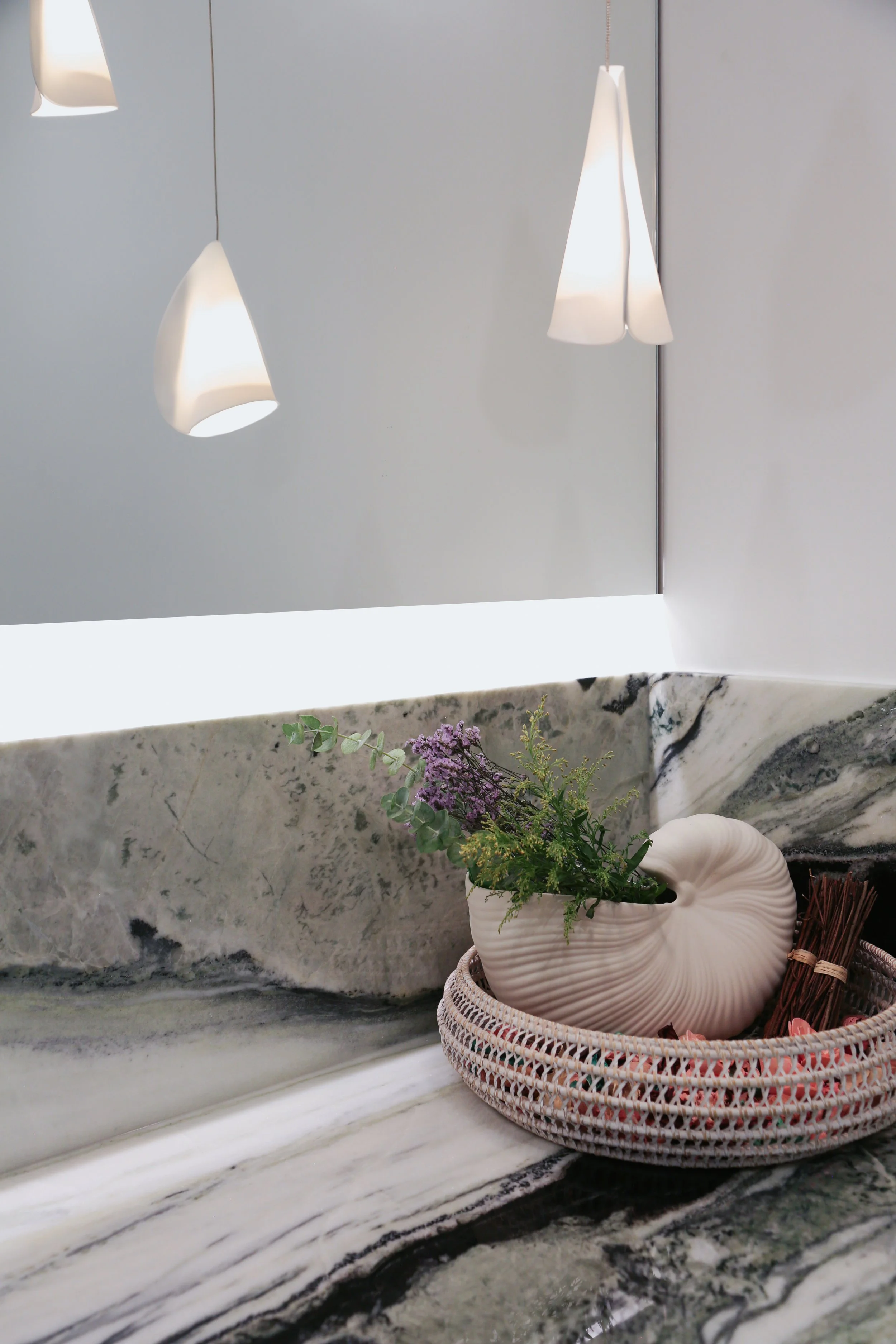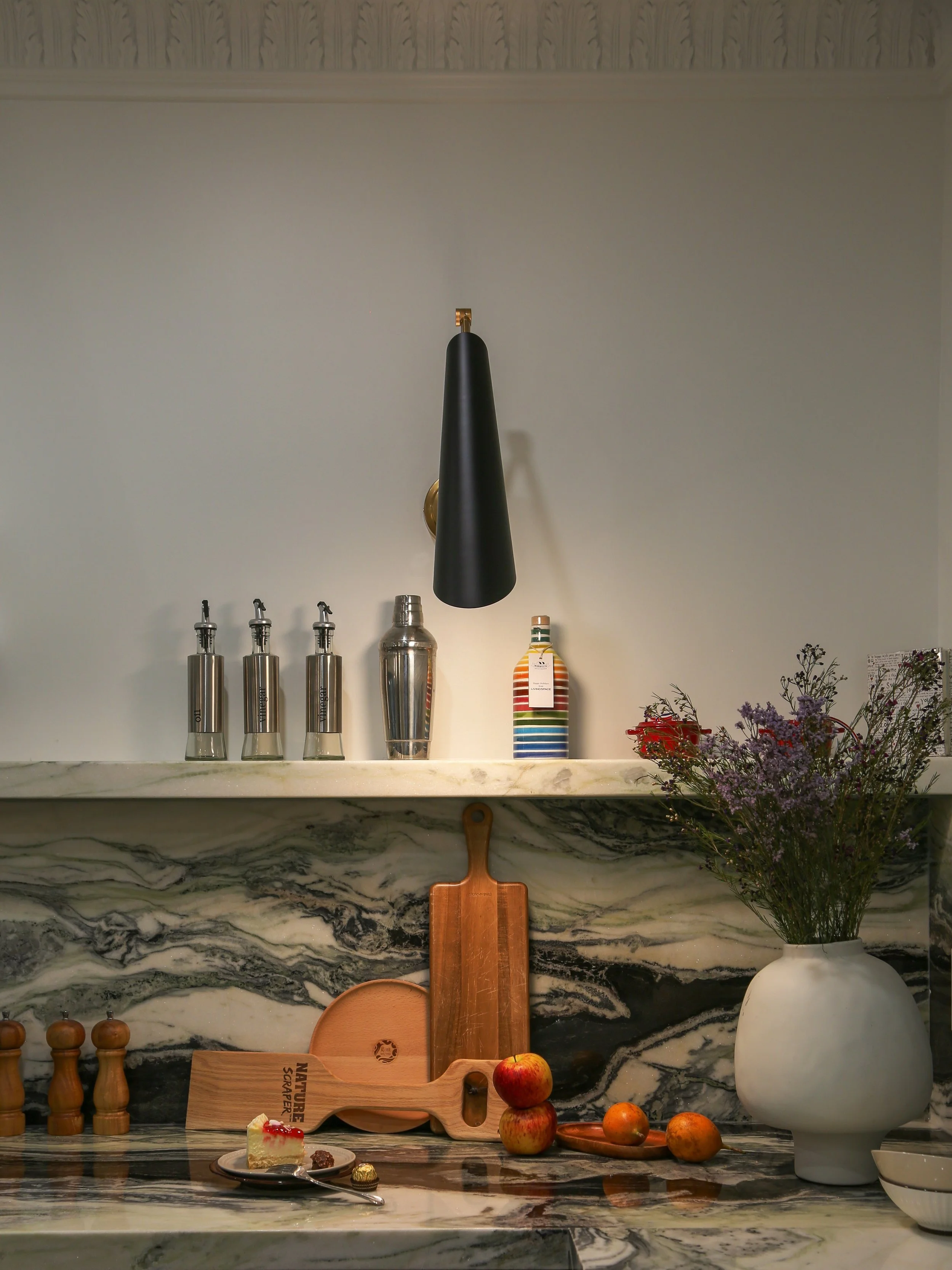 Each light fixture has been thoughtfully curated to enhance the space. As night falls, the soft lighting accentuates the textures and contours, while delicate shadows introduce depth, evoking a refined sense of tranquil sophistication.