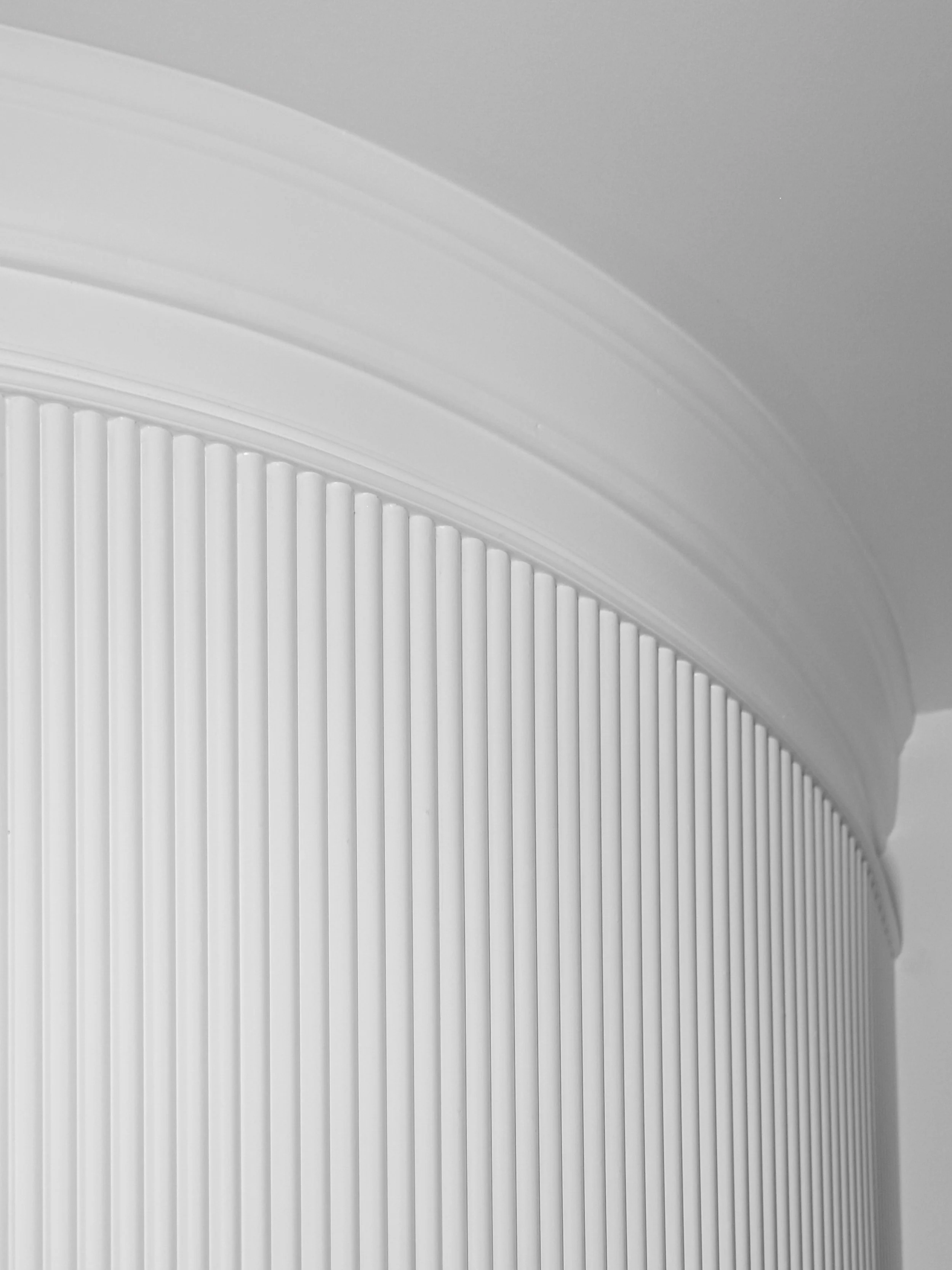 The adjacent curved glass brick wall softens the sunlight, creating a dialogue between the original materials and the new design.