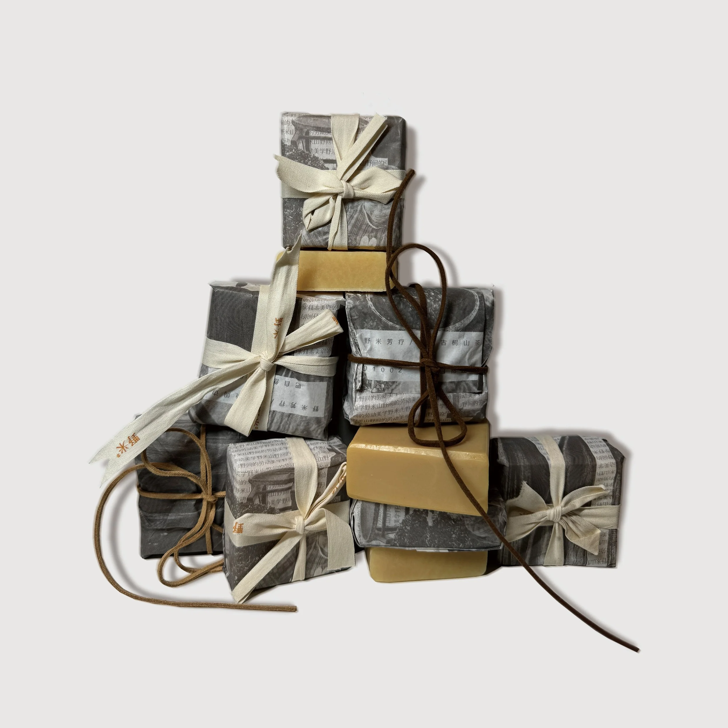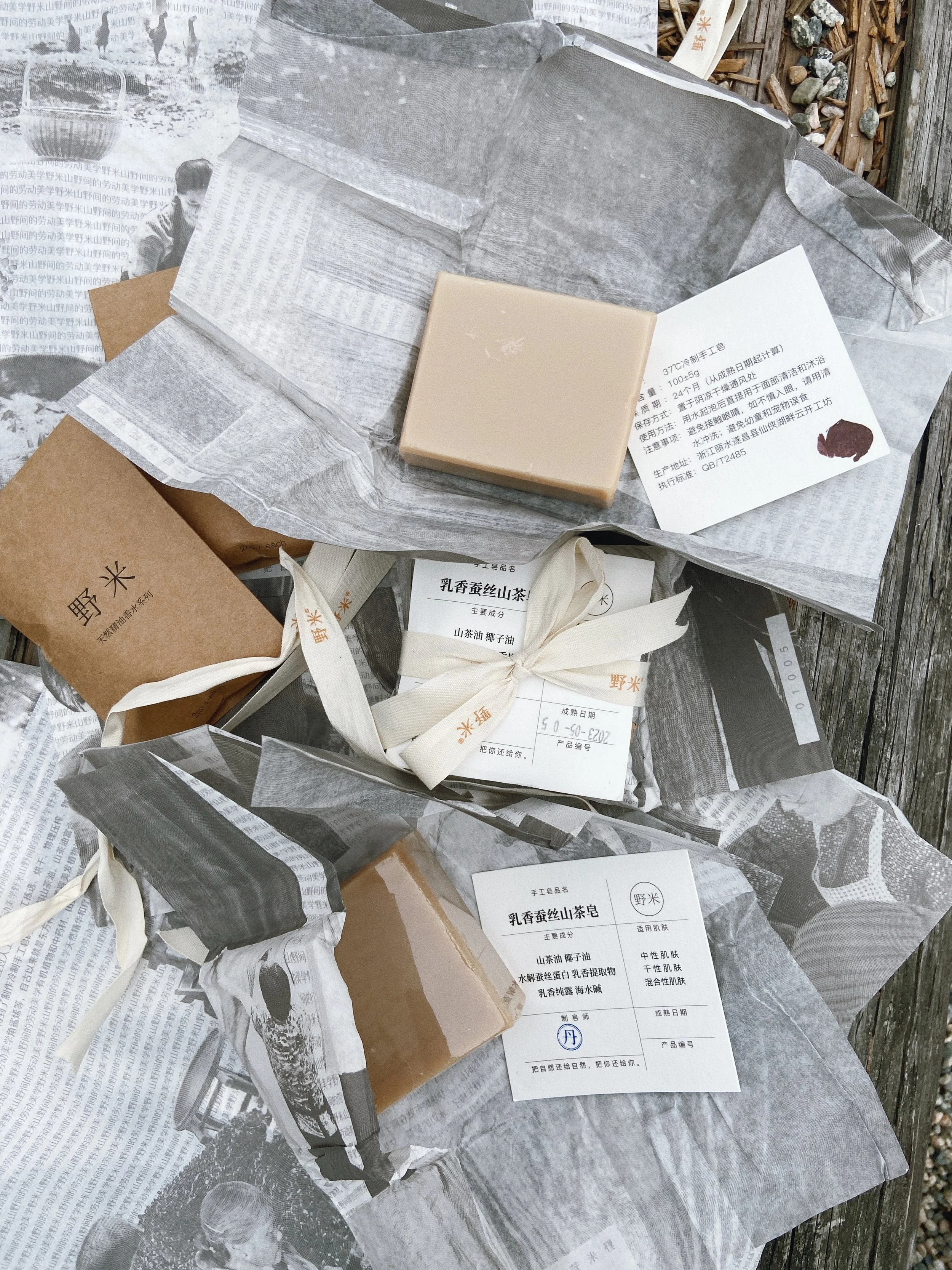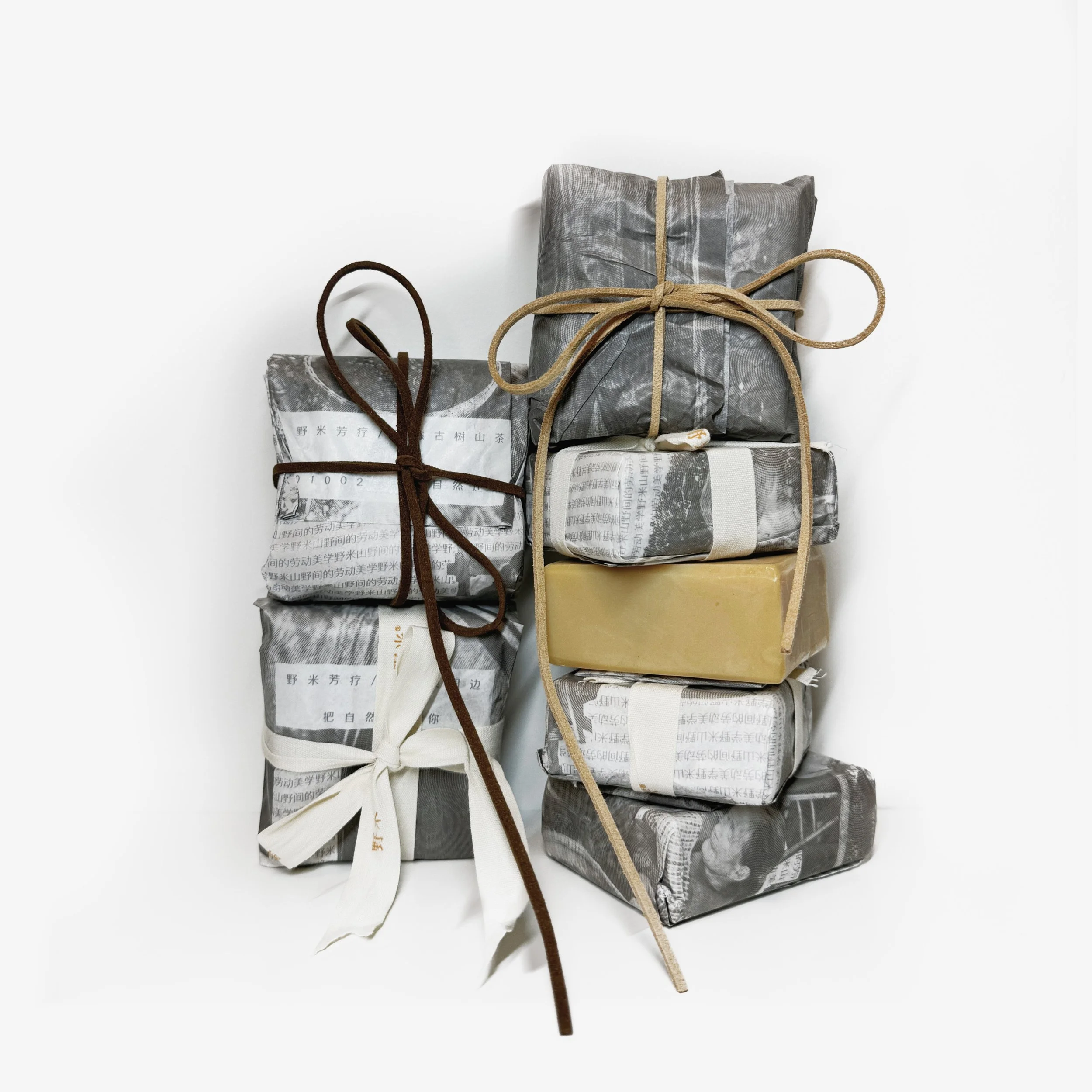 The design seamlessly blends images with text, creating multiple layers to captivate users and encourage exploration of the information conveyed through the soap packaging. The description of the making process was hidden in the repetitive Chinese characters. Within the text backgrounds, each shot embeds descriptions of the handmade process, providing surprises for the users. The packaging paper subtly reveals the soap's colors, enticing users to untie the ribbon and explore the essence of nature