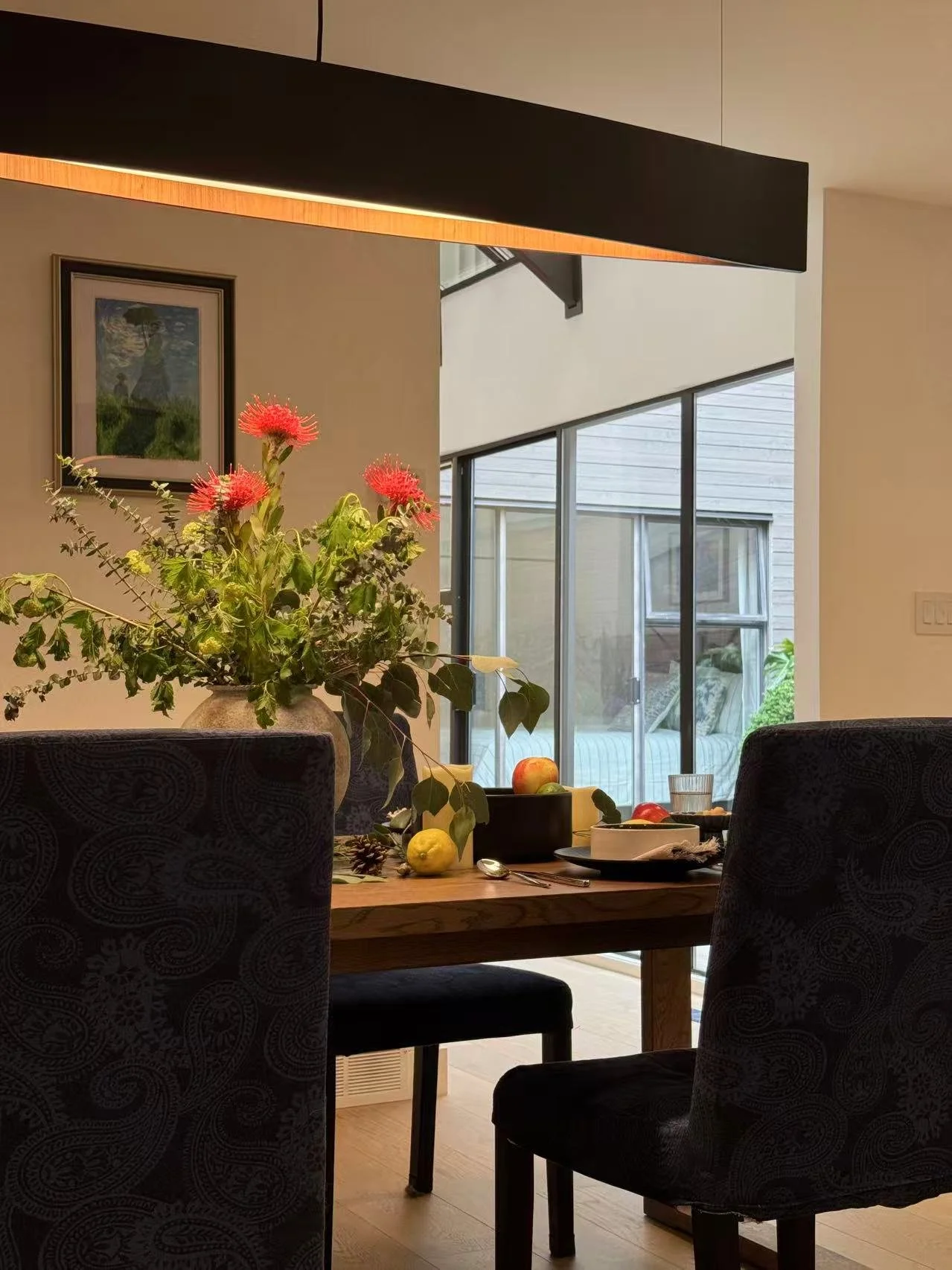 Skylights and full-height windows invite seasonal light into the interior, turning each wall into a living canvas. As daylight drifts and shifts, the space becomes quietly illuminated.